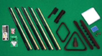 Hardwood 15 ball rack, 9 ball triangle and 8 cue wall rack 4 - two-piece 57" cues with nylon wrap in four colors Two piece bridge stick with aluminum bridge head Cue tip repair kit, pool table cover, 12 pieces of chalk, shaker bottle, tally balls and chalk holder Table brush and rail brush Premium ball set - Lifetime Guarantee -